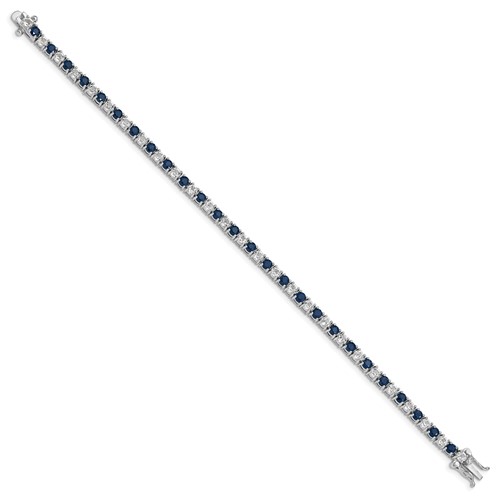 Sterling silver blue sapphire and white topaz line bracelet has a box clasp. Bracelet length: 7 inches. Each round blue sapphire and white topaz gemstone is 3mm in diameter. Rhodium-plated. Approximate weight: 11.4 grams. Made in China. Ships from USA.
