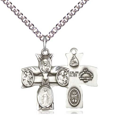 Sterling silver four way medal with holy spirit dangles from a 24-inch sterling silver curb chain with lobster clasp. Dimensions: 3/4in x 5/8in. This item is the size of a penny. Made in USA. Die struck, hand-engraved.