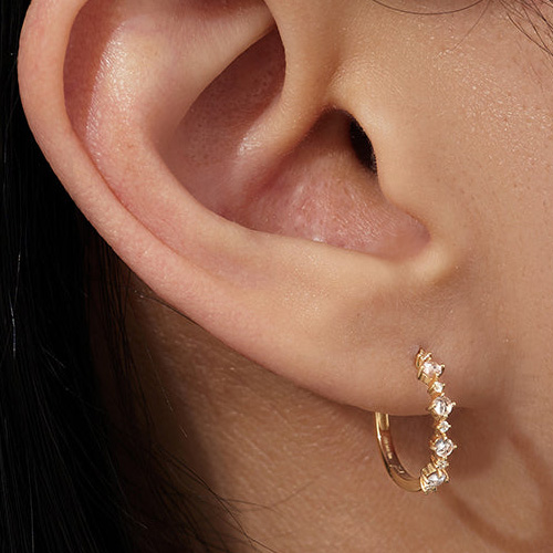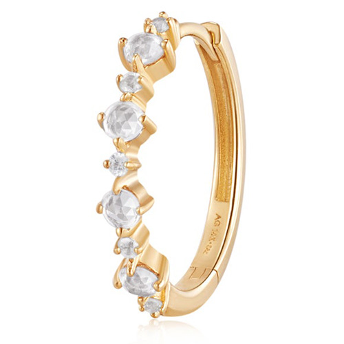 Aurelie Gi 14k yellow gold rose-cut white sapphire single hoop earring has a snap down closure. Earring diameter: 15.5mm, thickness: 3mm. The round white sapphires alternate in size from 1mm to 2mm. Approximate weight: 1.0 gram. Made in China. Ships from USA.