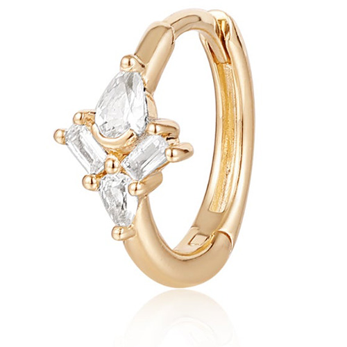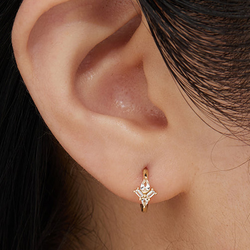 Aurelie G AURORA 14k yellow gold single huggie hoop earring features pear and baguette cut white sapphires. Earring diameter: 12.5mm, thickness: 1.5mm. Approximate weight: 0.9 gram. Made in China. Ships from USA.