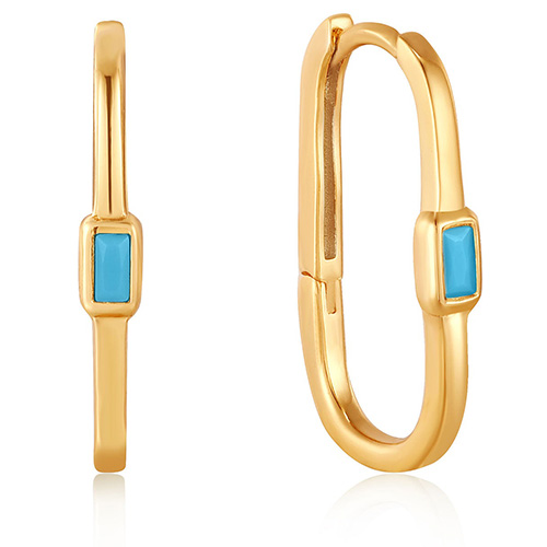 Ania Haie created turquoise oval hoop earrings are made of 14k yellow gold-plated sterling silver. Earring length: 3/4in. Hinged earrings have a snap down closure. Designed in London and made in China. Approximate weight: 2.0 grams. Ships from USA.