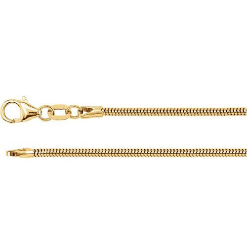 This solid 14k yellow gold round snake chain has a lobster clasp. Length: 20in. Width: 1.5mm. Approximate weight: 6.2 grams.Made in Italy. Ships from USA.
