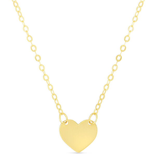 This mini 14k yellow gold flat heart necklace has a smooth polished finish. Heart size: 5.9mm x 5.9mm. The slender 14k yellow gold cable chain is adjustable in length from 16in to 18in. Spring ring clasp. Approximate weight: 0.7 grams. Made in Turkey. Ships from USA.