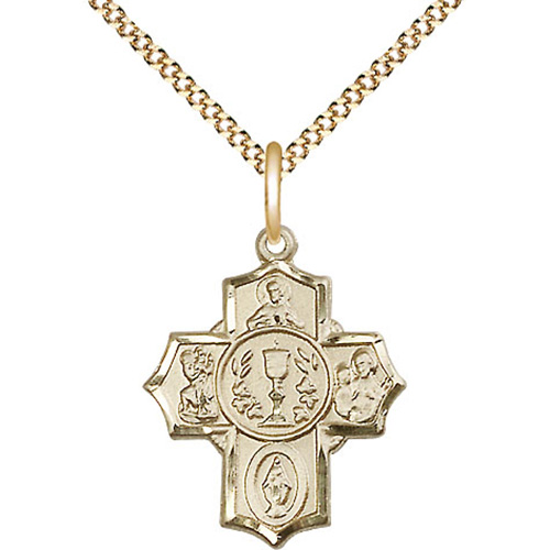 This first holy commmunion five way medal necklace is made of gold filled sterling silver. Pendant size: 7/8in x 3/4in. The cross has the scapular at the top, Saint Christopher right, miraculous medal at the bottom, Saint Joseph on the left and communion in the center. Gold plated sterling silver 18-inch curb chain has a lobster clasp. Made in USA.