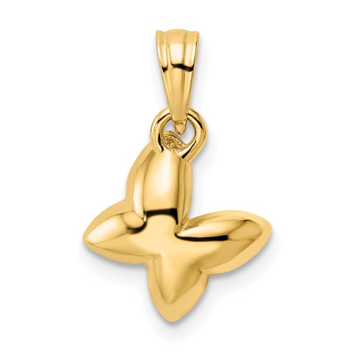 This small butterfly pendant is made of diamond-cut rhodium and 14k yellow gold. Item size: 1/2in x 1/2in without bail. Fits up to a 3mm wide chain. Approximate weight: 1.9 grams. Made in Peru. Ships from the USA.