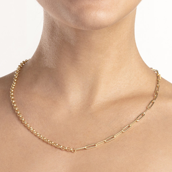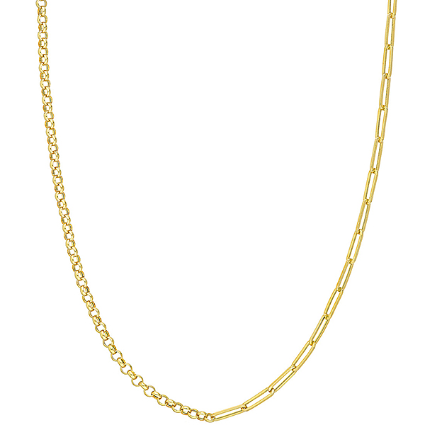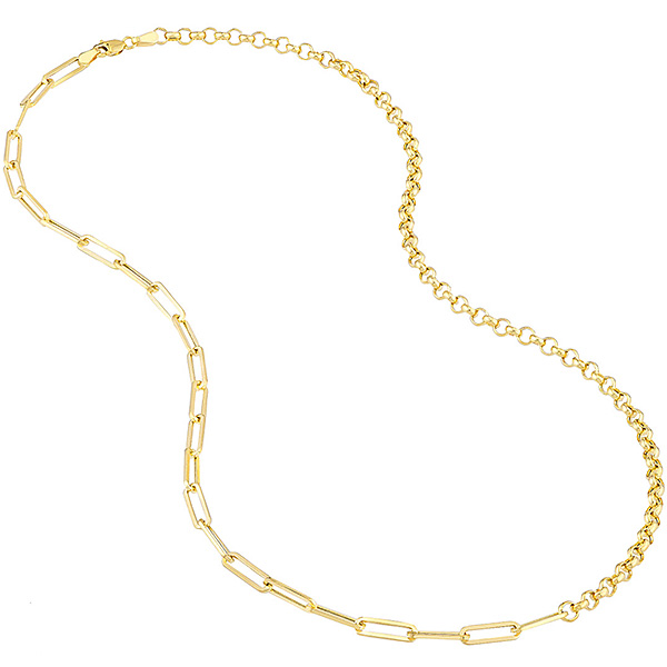 14k yellow gold 50/50 paper clip and rolo chain necklace has links of two different styles and a lobster clasp. Link width: 3.8mm. Necklace length: 20in. Made in Turkey. Ships from USA.