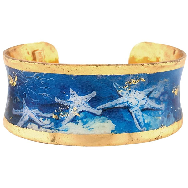 Evocateur blue starfish cuff bangle bracelet is handcrafted with 22k yellow gold leaf on brass and enamel. Slip-on bracelet is made to order and artisan quality. This bracelet features art from Rachel Pierce. Bracelet width: 1 inch. Bracelet diameter: 2.5 inches. Made in USA.