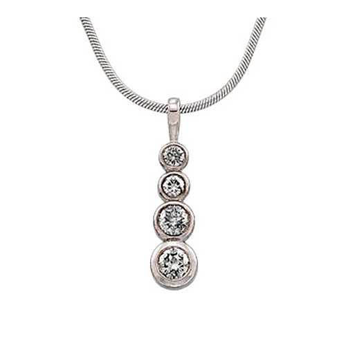 Show your sweetheart your love with this four-stone diamond bezel pendant crafted in 14k white gold. Diamond details: 1 x .06CT, 1 x .07CT, 1 x .15CT, 1 x .25CT round facted full cut diamonds; color G-I, clarity I1. Bezel set. Chain not included.