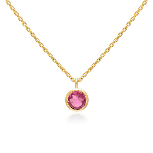 14k rose gold 0.43 ct pink sapphire solitaire necklace has a lobster clasp. 5mm round pink sapphire, AAA quality. Bezel set. 14k rose gold 16 to 18 inch adjustable cable chain. Chain width: 0.75mm. Ships from USA.