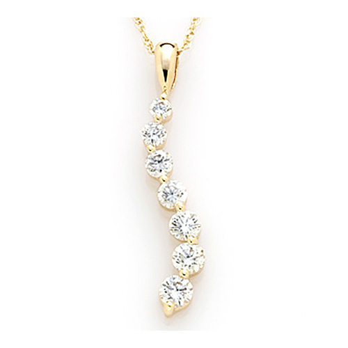3/4 carat total weight diamond Journey pendant necklace is made of 14k yellow gold. Show your sweetheart your love with this seven stone diamond pendant. Includes 18-inch rope chain with spring ring clasp. Diamond details: round facted full cut diamonds; color I-J, clarity I1.