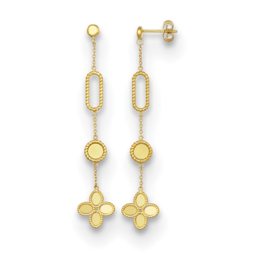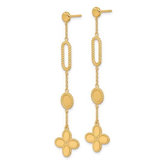 14k yellow gold clover and open oval link dangle earrings have textured rope borders and a polished finish. Earring length: 2.5in. Posts with push on / pull off backs. Approximate weight: 4.0 grams. Made in Italy. Ships from USA.