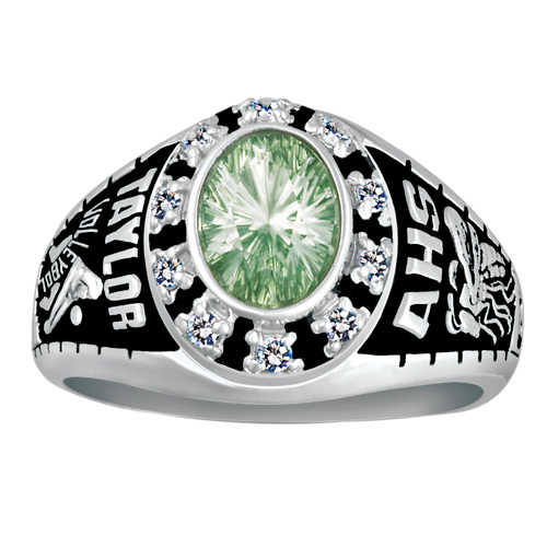 The girls' 14kt white gold Alecto class ring has a cubic zirconia bezel and oval 8mm x 6mm stone. Ring is handcrafted in the USA by Gold Lance. Personalize this ring with your choice of activity, school mascot, name and graduation year.