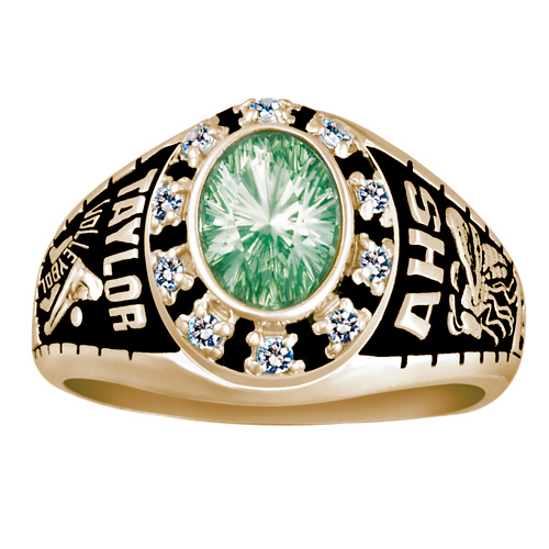 The girls' 10kt yellow gold Alecto class ring has a cubic zirconia bezel and oval 8mm x 6mm stone. Ring is handcrafted in the USA by Gold Lance. Personalize this ring with your choice of activity, school mascot, name and graduation year.
