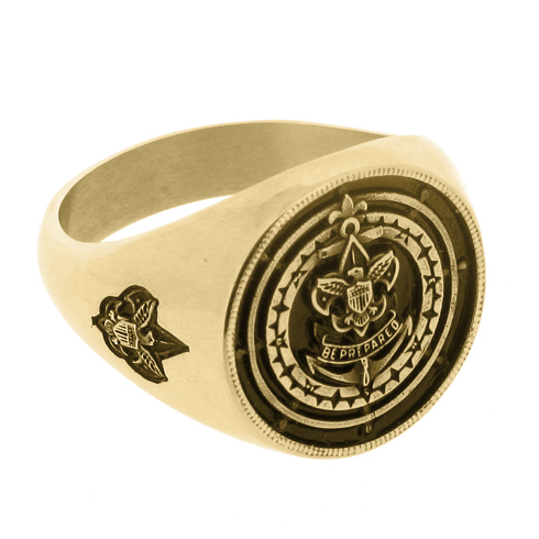 Celebrate the adventure and leadership of your Sea Scouting career with the golden siladium Quartermaster Signet ring. Finely crafted and antiqued BSA logos on both sides. Reads Be Prepared on the top ribbon. Import.