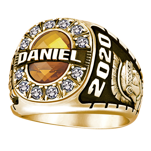 The Canto class ring has a cubic zirconia bezel with graduation year or name on top of the oval stone. This ring is handcrafted in AmberXT. Made in the USA by Gold Lance. Customize the top with your name or year date. Personalize with your choice of favorite side panels. This ring is also available with genuine diamonds.