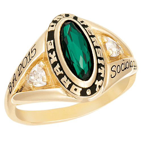 The 14kt yellow gold Dahlia college ring features your school name around the oval stone. Diamond or cubic zirconia side stones are nestled next to two two engraving areas for your degree and graduation year. Handcrafted in the USA by Gold Lance.