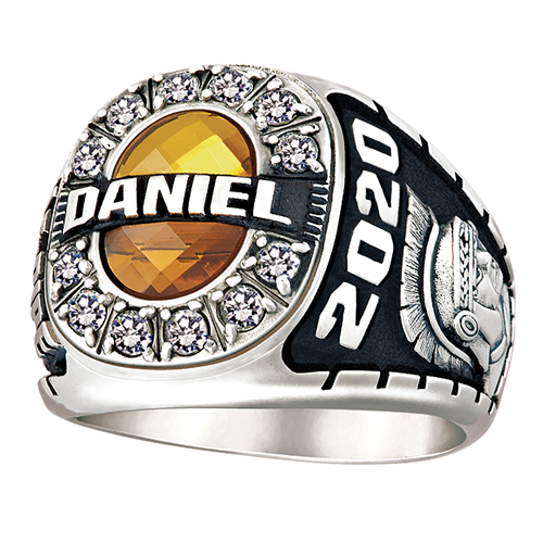 The boys' Canto class ring is made of white lazon and features a cubic zirconia bezel. Customize the top with your name or year date. Personalize with your choice of favorite side panels. This ring is also available with genuine diamonds. Handcrafted in the USA by Gold Lance.