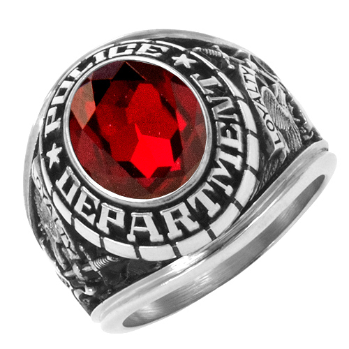 The white lazon personalized police ring offers your choice of stone color, wording around the stone and side engravings. 12mm x 10mm oval stone on top. Handcrafted in USA by Gold Lance.