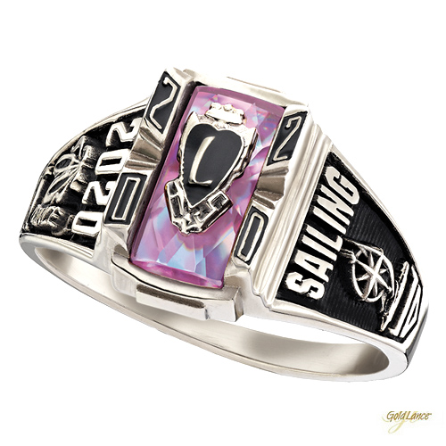The 14kt white gold Primrose class ring features a crest style top and a 9.5mm x 4.5mm rectangular stone. The graduation year is displayed on top. Ring is handcrafted in the USA. Personalize this Gold Lance class ring with your choice of activity, school mascot, name and graduation year.