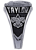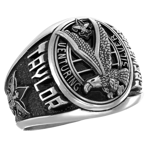 The Venturing Silver Award ring is crafted in siladium and features the silver award emblem on top. Choose side emblems and engravings. This ring is officially licensed by the Boy Scouts of America. Handcrafted by ArtCarved. Import.