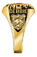 The golden siladium Patriot police ring for women offers your choice of engravings and stone color. This ring offers the standard wording POLICE DEPARTMENT on the outer bezel. Solid back ring is made of Golden Siladium [fine jeweler's stainless steel with a gold tone] and is handcrafted by ArtCarved. Enjoy ArtCarved's limited lifetime warranty. Ring top width: 13.5mm, palm width: 3.5mm.