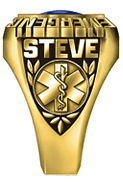 The 14kt white gold Patriot EMT ring for men offers your choice of engravings and stone color. The single bezel ring offers the standard wording around the stone: EMERGENCY MEDICAL TECHNICIAN. The solid back Patriot ring is 21.4mm across the widest part on top; 30mm from top of stone to bottom of ring shank. Palm width: 6.4mm. Handcrafted in the USA. Enjoy ArtCarved's limited lifetime warranty.