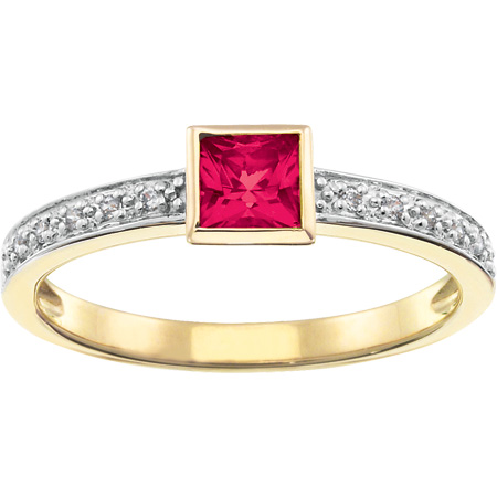 The polished 10kt yellow gold princess stacking ring is set with a 4mm x 4mm square gemstone of your choice. 12 x .5pt cubic zirconia accent stones decorate the band. The ring is 2.5mm wide. This style is available in whole and half finger sizes, 4-10. Standard fit.