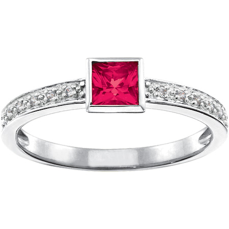 The polished 10kt white gold princess stacking ring is set with a 4mm x 4mm square gemstone of your choice. 12 x .5pt cubic zirconia accent stones decorate the band. The ring is 2.5mm wide. This style is available in whole and half finger sizes, 4-10. Standard fit.