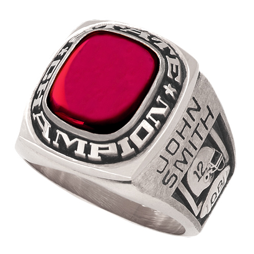 The men's Success championship ring in SilverXT features a 12mm x 10mm oblong simulated stone. Solid back ring is handcrafted in the USA by Gold Lance. Personalize it with your choice of favorite activity, school mascot, name and graduation year. This design is available with year date with diamonds.