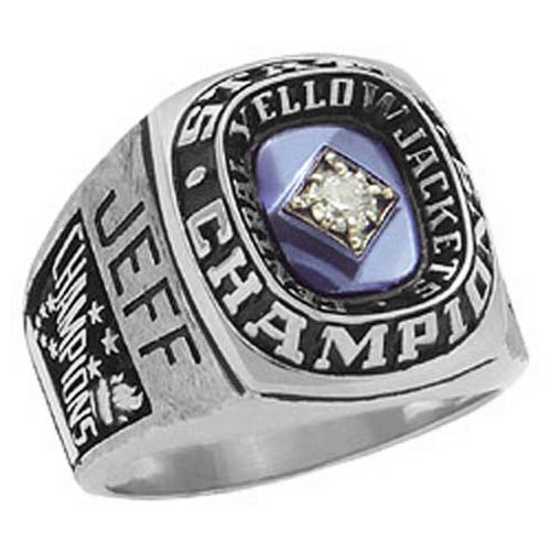 The Endurance championship ring in white lazon features a 12mm x 10mm oval simulated stone. Solid back ring is handcrafted in the USA by Gold Lance. Personalize it with your choice of favorite activity, school mascot, name and graduation year. This design is available with year date with diamonds. Please note, 25 ring minimum order is required.