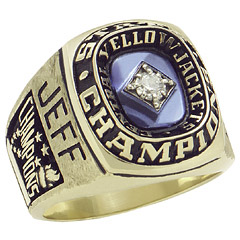 The 10kt white gold Endurance championship ring features a 12mm x 10mm simulated stone. Solid back ring is handcrafted in the USA by Gold Lance. Personalize it with your choice of favorite activity, school mascot, name and graduation year. This design is available with year date with diamonds. Please note, 25 ring minimum order is required.