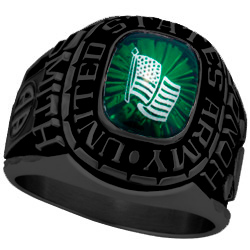 The Independence army ring is made of eclipse valadium and handcrafted by Balfour. Choose the wording around the stone, stone color, side emblems and engravings. The oblong stone is 12mm x 10mm. Eclipse Valadium is fine jeweler's stainless steel with a black tone. Contains 12% nickel. Import.