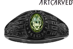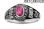 The girls' Petite class ring is a medium designer ring style from ArtCarved. The ring features a 6mm x 4mm oval simulated stone. Ring top width: 9.8mm, palm width: 2.0mm. The Petite class ring has a solid back and is handcrafted by ArtCarved.