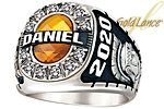 The men's Canto class ring has a cubic zirconia bezel around an oval stone. Customize the top with your name or graduation year. Personalize with your choice of side emblems and engravings. This high school ring is also available with genuine diamonds. This Gold Lance class ring is handcrafted in the USA.