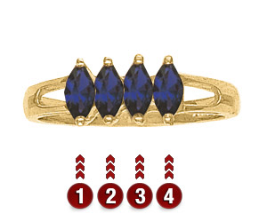 Marquise-cut stones are set in a solid gold band. The Memorable Marquise ring measures about 6mm at the top center. This ring accepts 2-7 stones that are 5mm x 2.5mm.
