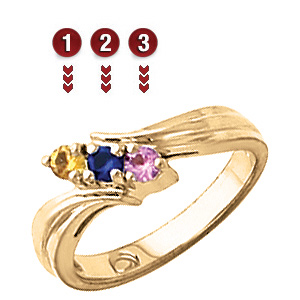 The ring's band has graceful grooves of gold. This ring features personalization for 3 round birthstones. Each prong-set gemstone is 3.0mm in diameter. Choose simulated or genuine birthstones, 14kt yellow or white gold.