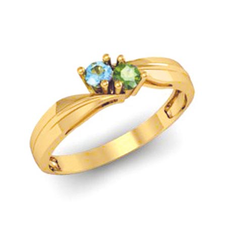The 14kt yellow gold Embracing Arms mother's ring offers stone personalization for two round genuine gemstones. Each gemstone is 3.0mm in diameter. Gold content weighs 3.25 grams. Made in USA.