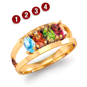 Unify mother's ring is made of polished 14kt yellow gold. This ring offers four 5mm x 3mm oval genuine gemstones of your choice. Split shank. Made in USA.