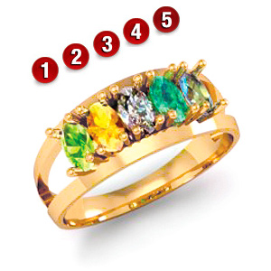 Unify mother's ring is made of polished 14kt yellow gold. This ring offers five 5mm x 3mm oval genuine gemstones of your choice. Split shank. Made in USA.