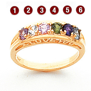 Polished 14k yellow gold. This ring offers stone personalization for 1-7 round gemstones. Each gemstone is 3.0mm in diameter. Choose simulated or genuine gemstones. Gold content weighs 3.5 grams. Made in USA.