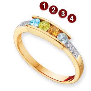 Choose polished 14k white or yellow gold only. This ring offers stone personalization for 1-4 round gemstones. Each channel-set gemstone is 2.75mm in diameter. Choose simulated or genuine gemstones. Made in USA. Both genuine and simulated stone rings have diamond accent stones .03 ct tw [ I1 clarity, G-I color].