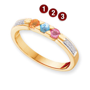 Choose polished 14k white or yellow gold only. This ring offers stone personalization for 1-4 round gemstones. Each gemstone is 3.0mm in diameter. Shared prongs. Choose simulated or genuine gemstones. Made in USA. Both genuine and simulated stone rings have diamond accent stones [ I1 clarity, G-I color].
