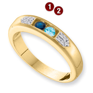 Choose polished 14k white or yellow gold only. This ring offers stone personalization for 1-4 round gemstones. Each gemstone is 2.75mm in diameter. Shared prongs. Choose simulated or genuine gemstones. Made in USA. Both genuine and simulated stone rings have diamond accent stones [.03 ct tw, I1 clarity, G-I color]. Weight: 3.25 grams.
