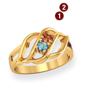 Make an elegant statement with this 14kt gold ring. This ring features personalization for 2 birthstones. Each prong-set gemstone is 2.5mm in diameter. It is available with simulated or genuine birthstones. Weight: 5.07 grams.