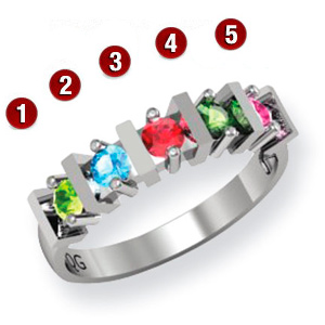 This ring features personalization for 5 birthstones. Each prong-set gemstone is 2.5mm in diameter. It is available with simulated or genuine birthstones. Weight: 2.98 grams.
