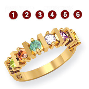 This ring features personalization for 6 birthstones. Each prong-set gemstone is 2.5mm in diameter. It is available with simulated or genuine birthstones. Weight: 3.13 grams.