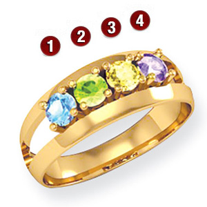 Make an elegant statement with this 14kt gold ring. This ring features personalization for 4 birthstones. Each prong-set gemstone is 3.5mm in diameter. It is available with simulated or genuine birthstones. Weight: 4.38 grams.