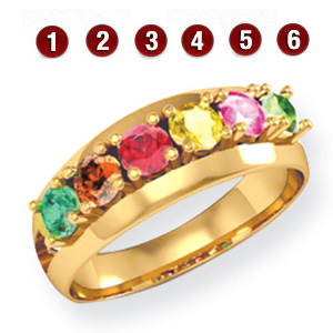 Make an elegant statement with this 14kt gold ring. This ring features personalization for 6 birthstones. Each prong-set gemstone is 3.5mm in diameter. It is available with simulated or genuine birthstones. Weight: 3.94 grams.