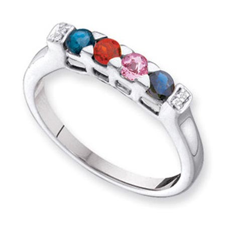 Choose polished 14k yellow or white gold. This ring offers stone personalization for 1-4 round gemstones. Each gemstone is 3.0mm in diameter. Choose simulated or genuine gemstones. Genuine diamond accents. Made in USA. Weight: 2.46 grams.