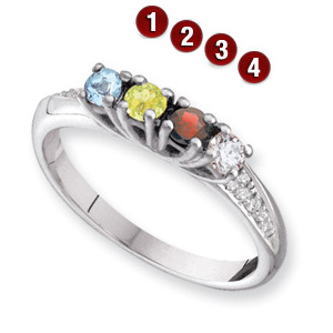 Choose polished 14k yellow or white gold only. This ring offers stone personalization for 1-4 round gemstones. Each prong-set gemstone is 2.75mm in diameter. Choose simulated or genuine gemstones. Made in USA. Both genuine and simulated stone rings have diamond accent stones [ I1 clarity, G-I color]. Weight: 2.25 grams, 0.04 diamond ct tw.
